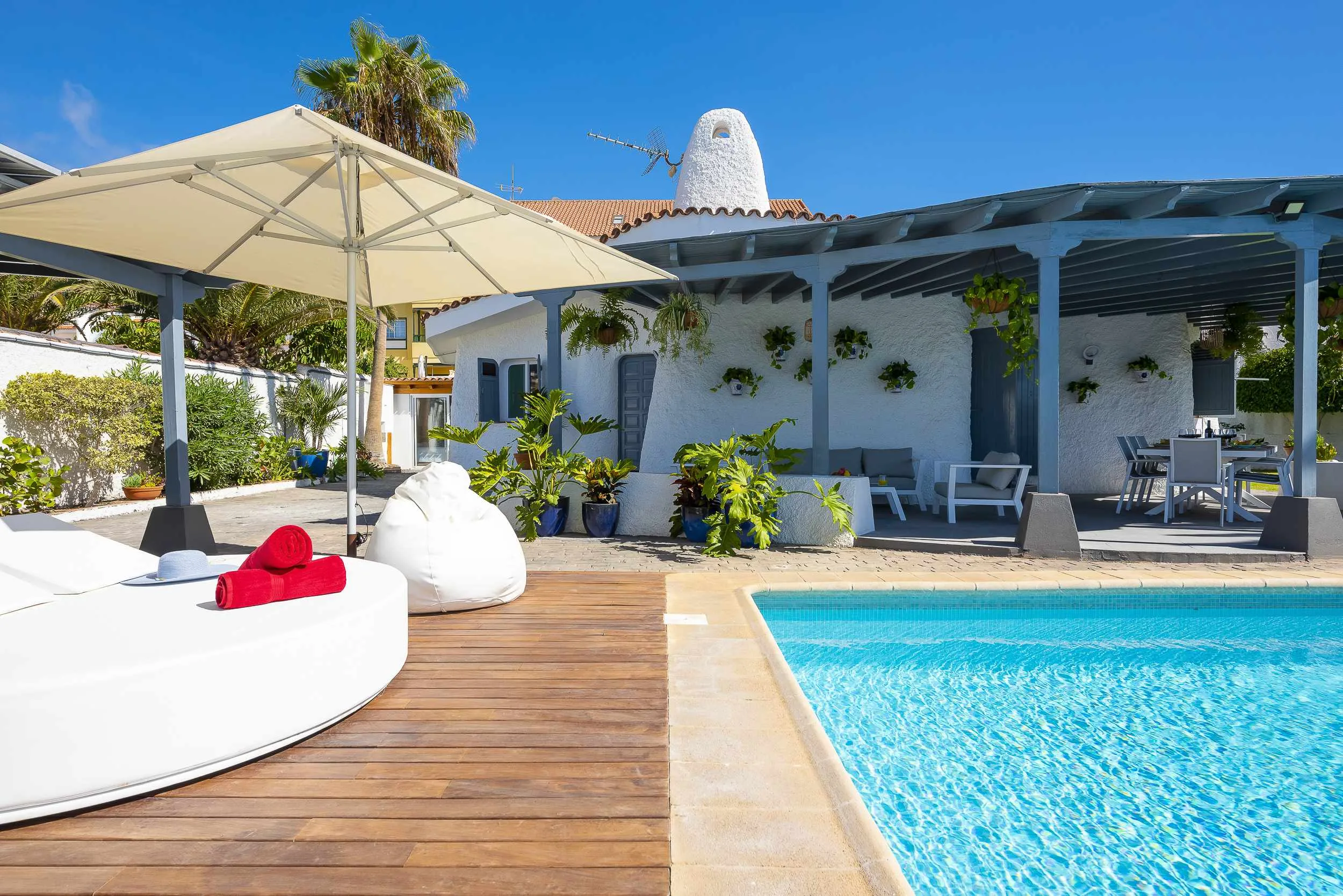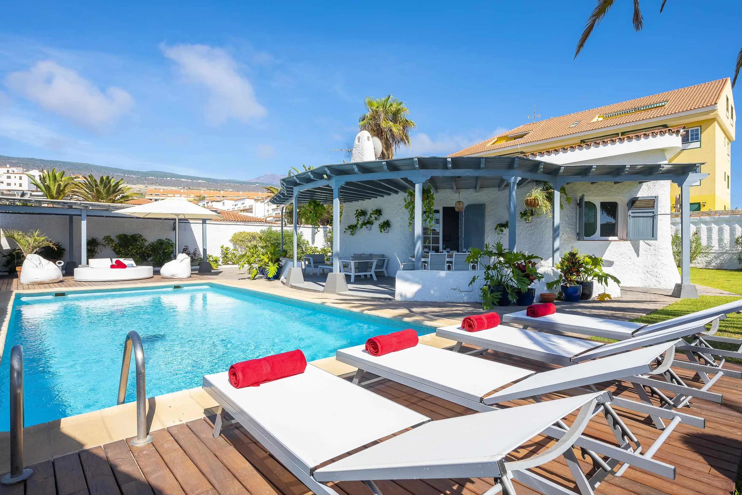 Villa compuesta con 4 habitaciones y 4 baños con piscina privada y jardín natural. 2 de las habitaciones se encuentran anexas a la casa principal con aire acondicionado cada una. Esta ubicada en la zona llamada Varadero, muy cerca a playa de la arena en Puerto Santiago. Piscina de 8x4m (Puede ser Climatizada según petición y coste 100€/semana). *Temperatura de piscina entre 24-26 grados Cocina completa con lavavajillas y horno y micro hondas. Wifi y TV en el Salón y en 2 de las habitaciones anexas. Zona de terraza con área chill out y mesa comedor para 10 personas. En la zona de piscina se dispone de hamacas, cama chill out y 2 pufs de exterior color blanco. Nota nº de Huéspedes: Para reservas inferiores a 4 huéspedes, no se habilitarán las habitaciones anexas. Se habilitarán según el número de huéspedes.
